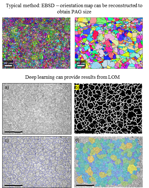 Obtaining quantitative results, such as grain size, from metallographic images is often limited to traditional methods like line intercept. This involves drawing test patterns (lines or circles) on microscope images and counting the intersections between the test patterns and grain boundaries. While these methods provide a good estimate of grain size, they require significant manual adjustment, are user-dependent, and do not yield adequate statistical results. EBSD is more commonly used and, for many materials, is the only method that can reliably obtain grain size distribution. Feasibility tests indicate that machine learning and deep learning methods have great potential to identify grain boundaries from images, even in complex microstructures where thresholding and conventional image analysis methods fail. Once grain boundaries are correctly identified, a Python script can provide grain size distributions comparable to those obtained from EBSD. This project aims to train robust methods for grain size analysis, potentially incorporating EBSD images and results in the training process.